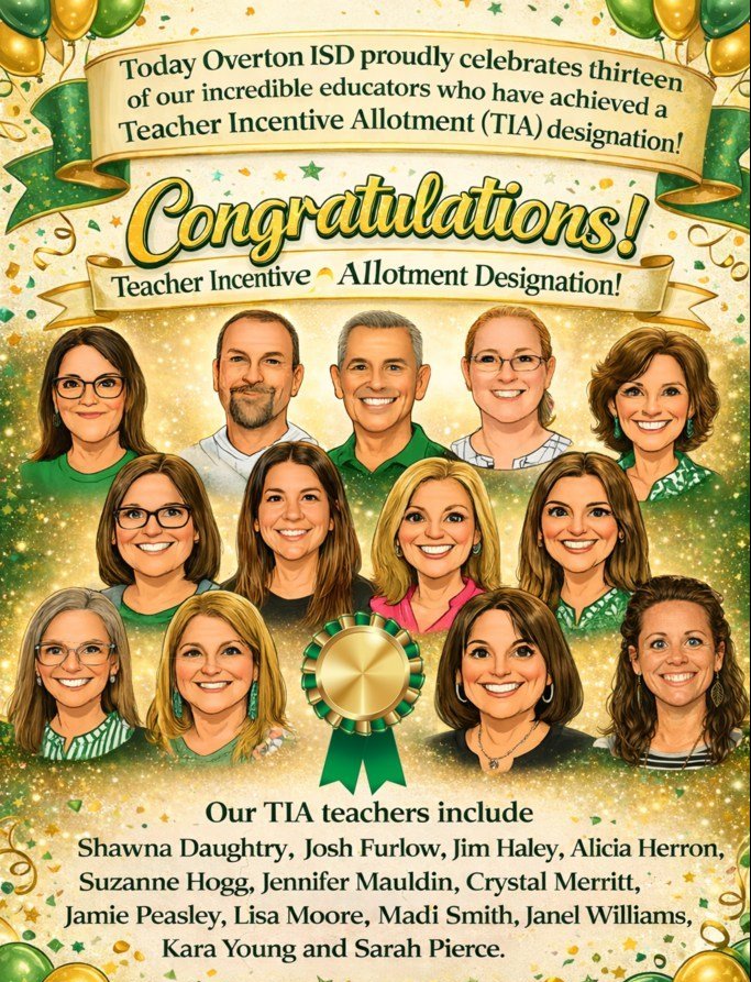 Overton ISD proudly celebrates thirteen outstanding educators who have earned a Teacher Incentive Allotment (TIA) designation—a well-deserved recognition grounded largely in student growth and achievement, and verified through rigorous student testing data. This designation reflects the measurable impact these teachers have on student learning and success.