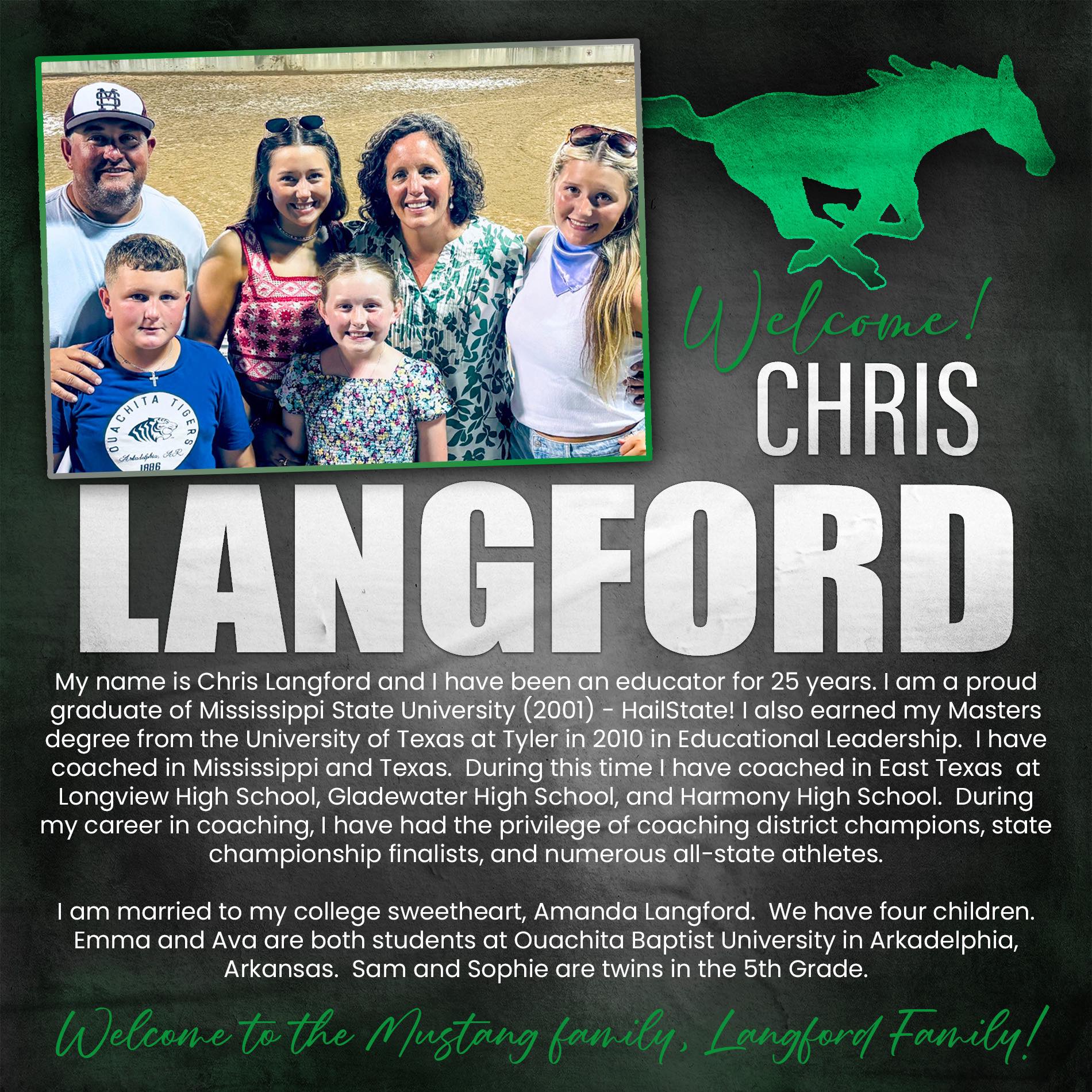 Mustang Family join us in welcoming Coach Chris Langford to Overton ISD. Coach Langford will be teaching at the High School and Middle School as well as coaching on the boys side. |
